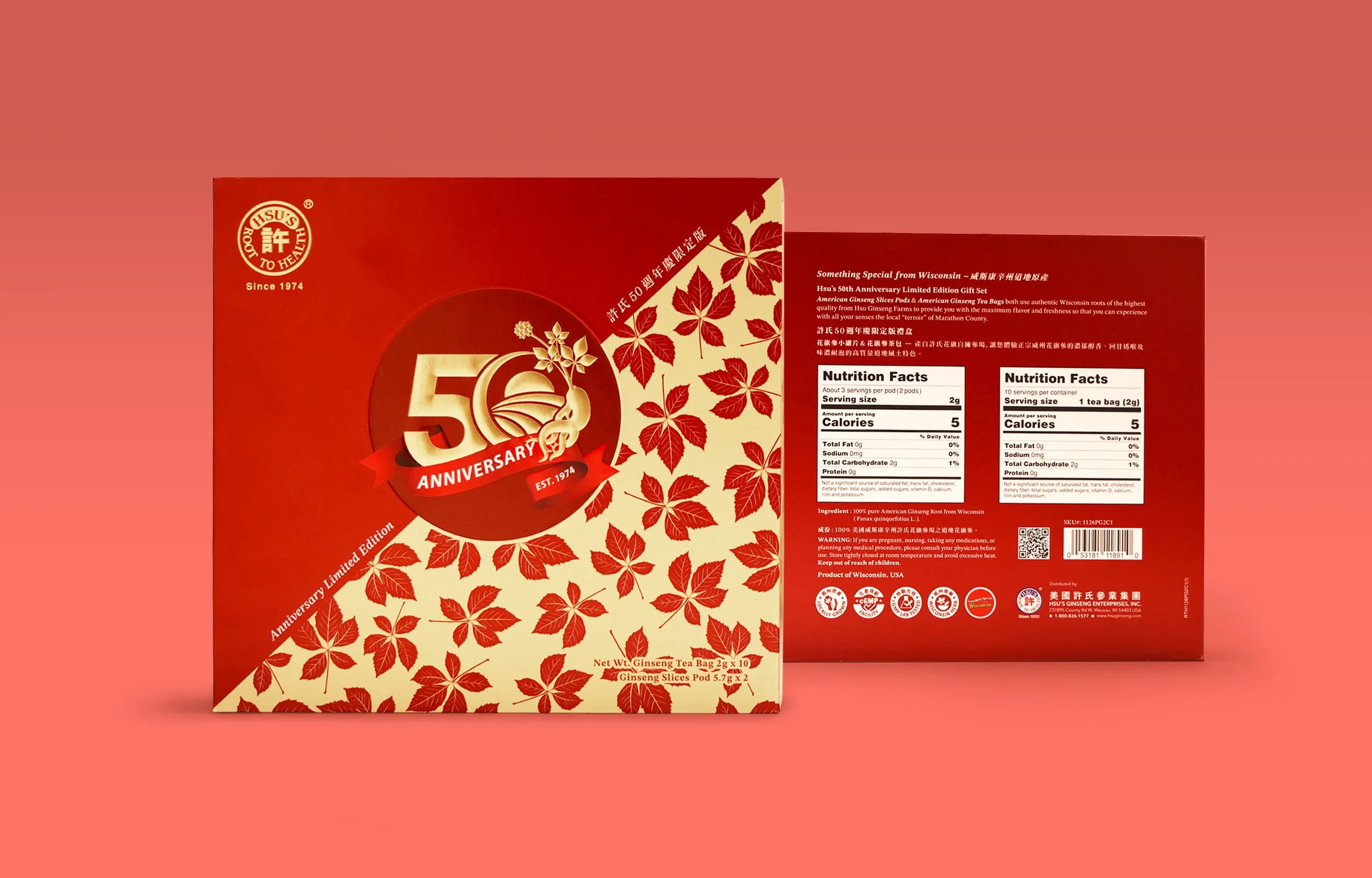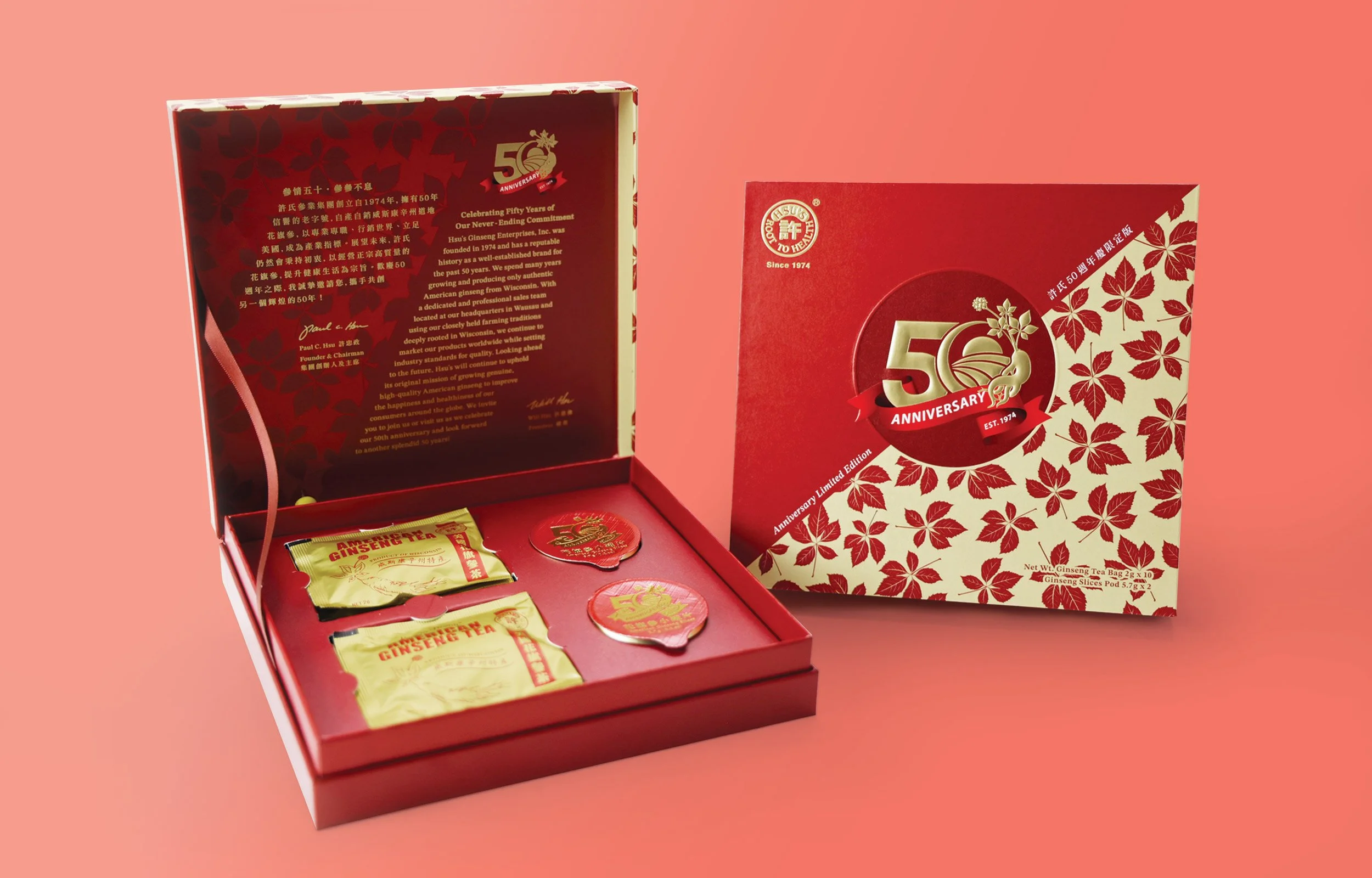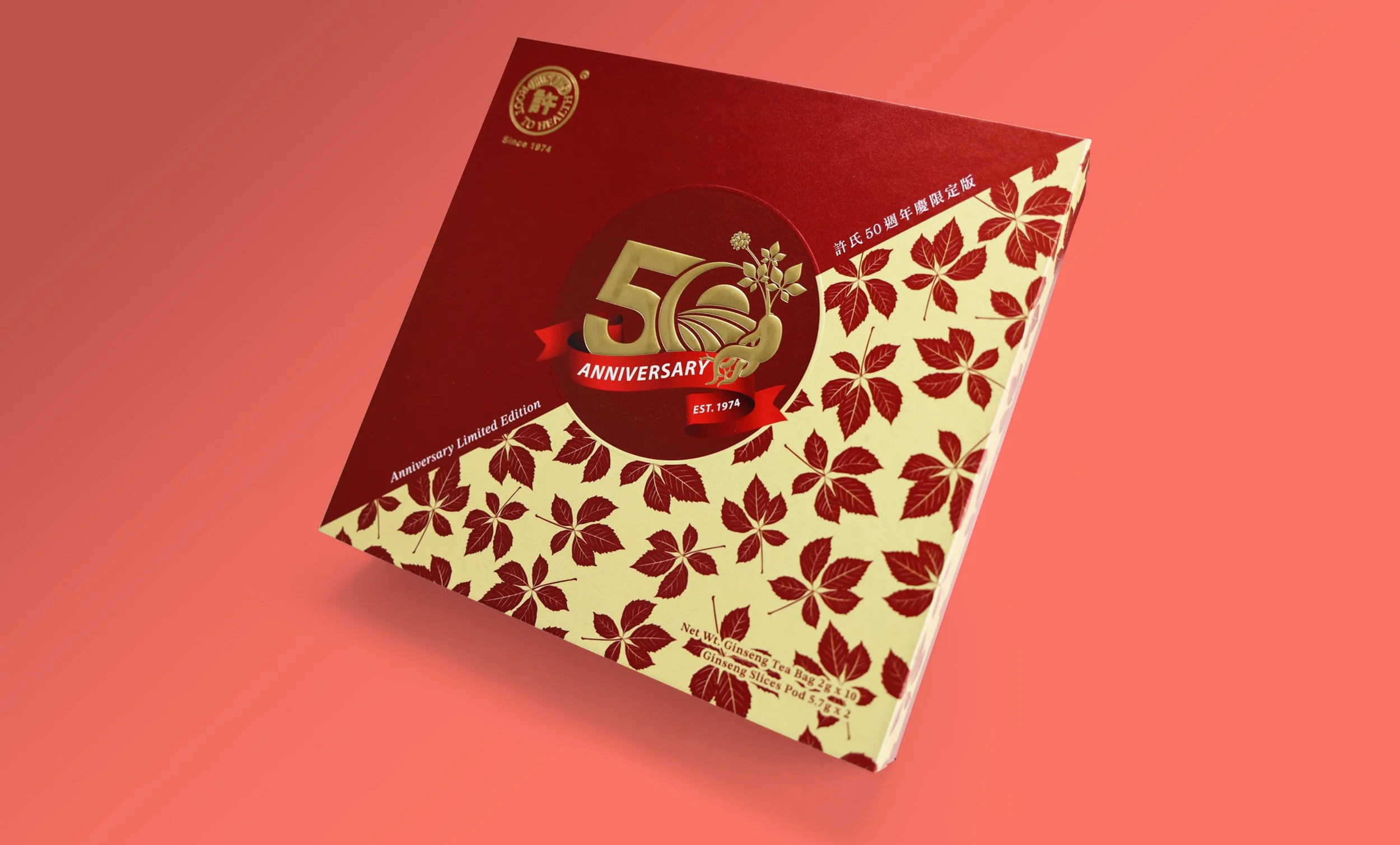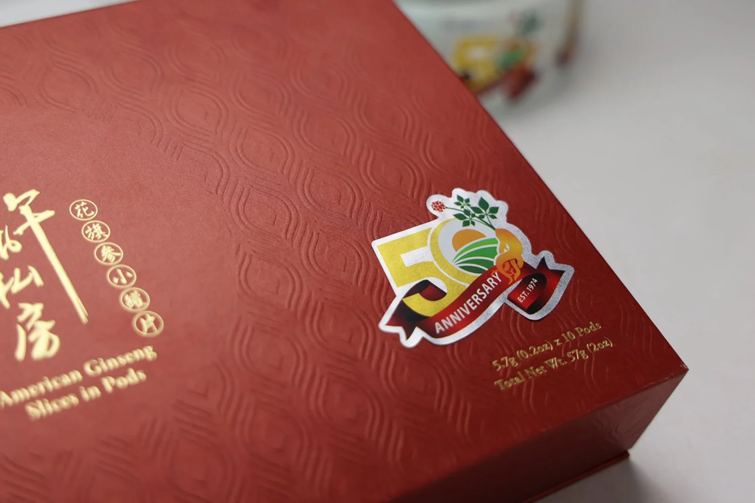 Pods - Designed pod-style packaging to protect delicate dried ginseng slices, maintaining freshness, convenience, and precise portions. Featured a gold foil stamped 50th Anniversary icon on the cover to emphasize the product’s premium quality and to celebrate its specialty.